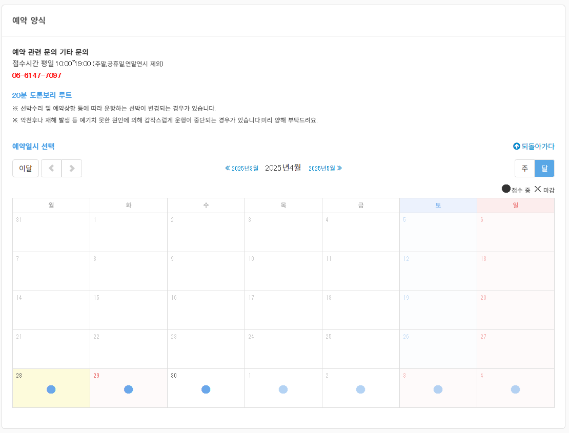 1. 인터넷 예약 화면에서 파란색 동그라미 쳐있는 곳 중 희망일자를 선택해준다 (파랑 동그라미 - 승선 가능일임)