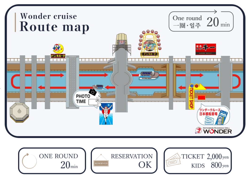 도톤보리강 북쪽 강변에 위치한 돈키호테 도톤보리점 1층 매표소에서 티켓을 구매할 수 있으며, 도톤보리 리버크루즈 타는 곳은 매표소 바로 앞에 위치해 있다. 그릴원더 앞, 파란 깃발이 눈에 띄는데 바로 그곳이 도톤보리 리버크루즈 타는곳임!!